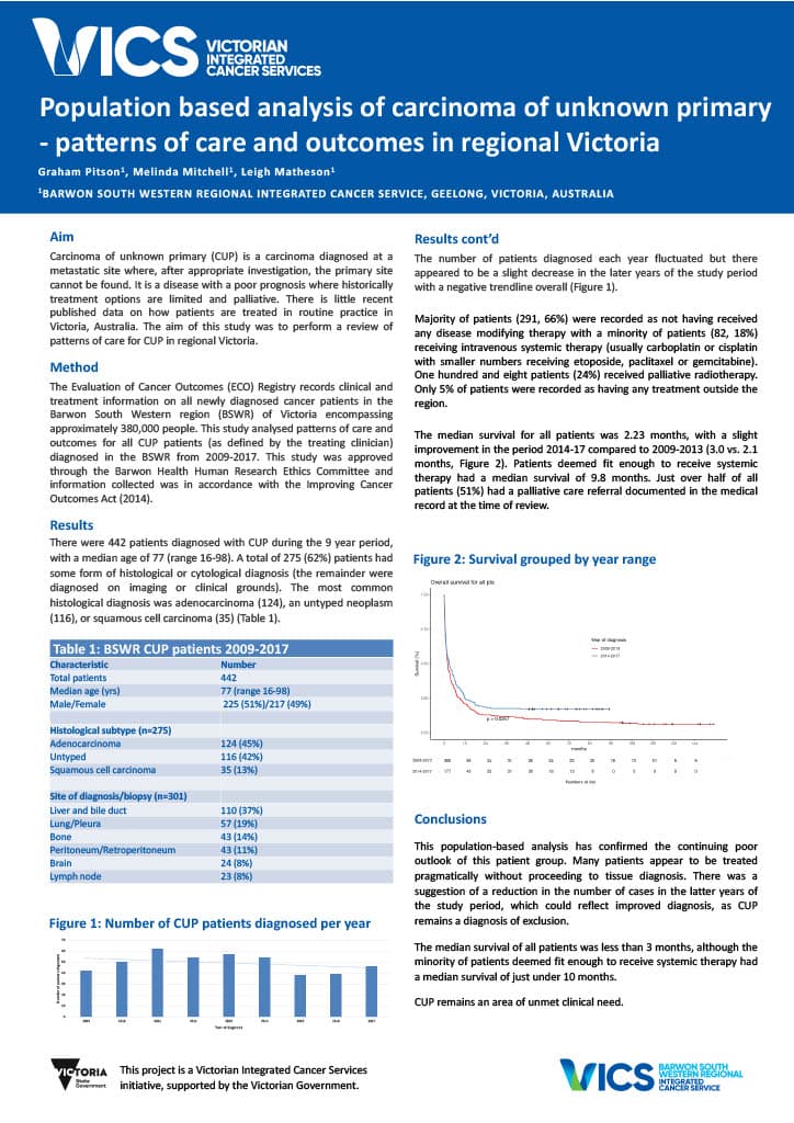 Dr Graham Pitson and the ECOBSW Registry team presented the poster ‘Population-based analysis of carcinoma of unknown primary – patterns of care and outcomes in regional Victoria’.