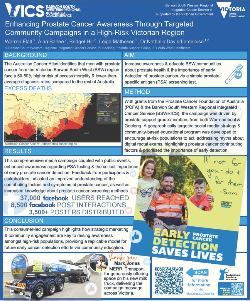 The BSWRICS Service Development team along with the Geelong Prostate Support Group and South West Healthcare presented the poster ‘Enhancing prostate cancer awareness through targeted community campaigns in a high-risk Victorian region’. You can read more about this project by visiting the prostate cancer awareness in Geelong and Warrnambool project page.