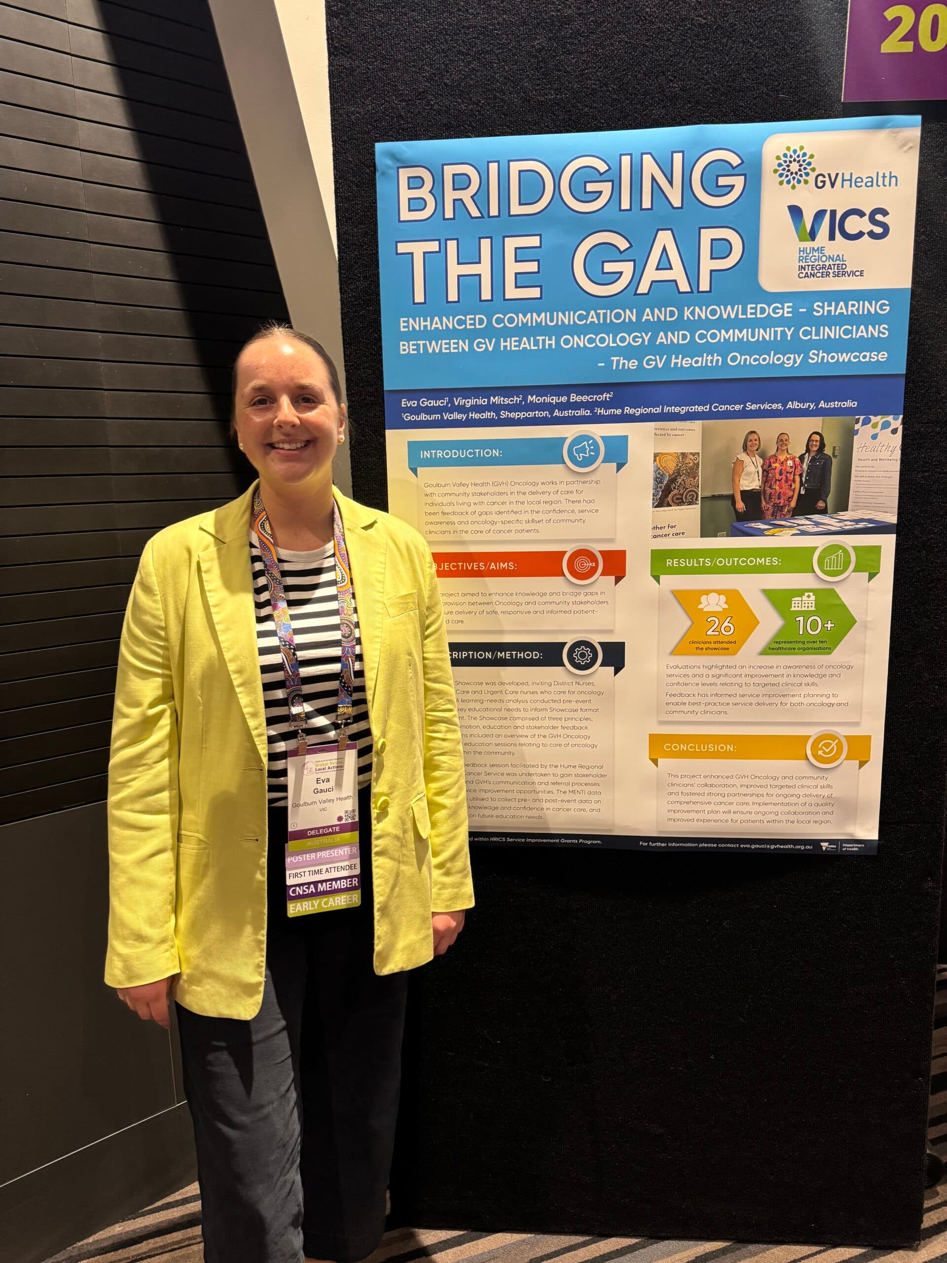 Eva Gauci (Oncology Nurse, GV Health) also had a poster presentation for a project that was funded and supported by HRICS, on sharing knowledge between GV Health Oncology and community clinicians (PDF here). Read more about HRICS’ Service Improvement Grants Program here.