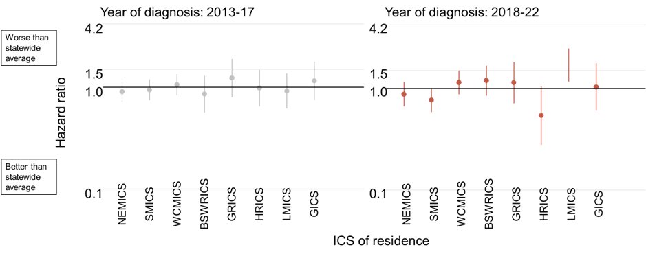 Figure 3. Cancer-specific mortality among endometrial cancer patients with high-grade tumours in the LMICS (Loddon Mallee Integrated Cancer Service) region was significantly worse than the statewide average in 2018–2022