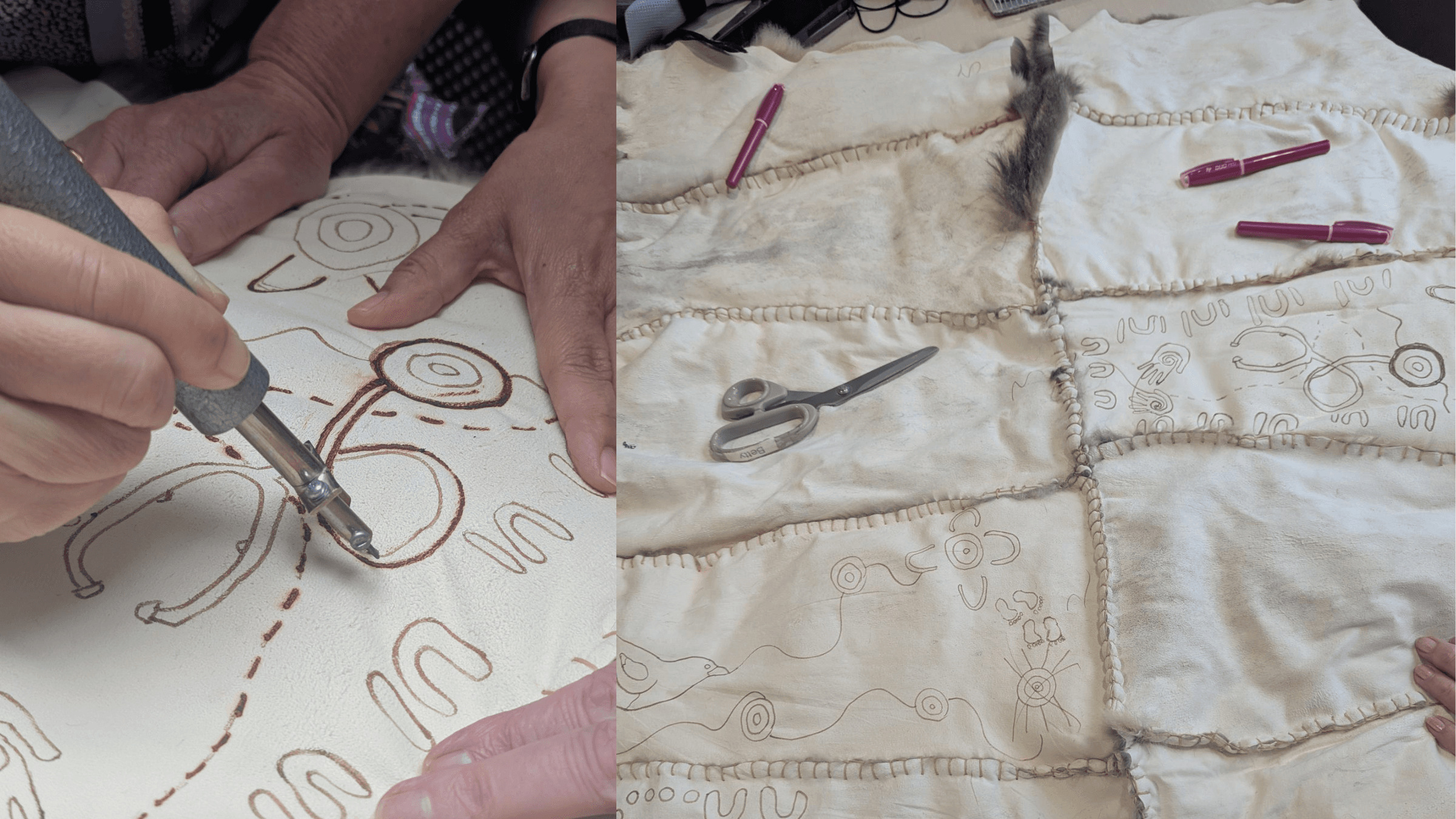 Participants took part in cultural workshops led by respected Aboriginal Elder Aunty Gina Bundle, where they created designs reflecting their own perspectives on reconciliation, which were then drawn, incised, and painted onto the pelts.